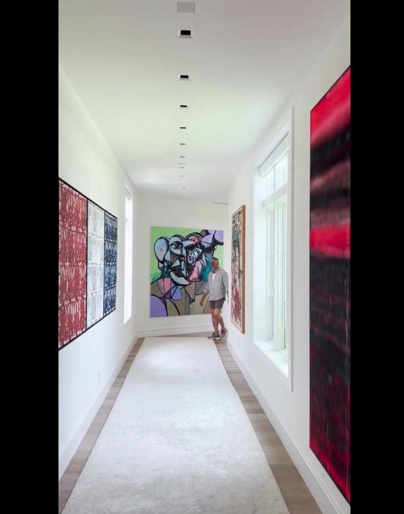 The creative vision of celebrity designer Martyn Lawrence Bullard brings personality to every corner of the property. Known for infusing spaces with warmth and glamour, Bullard chose performance fabrics, soft textures, and bold accents that complement both art and family activity. Art is treated not as static decoration but as a dynamic element of the home: paintings are moved, rotated, and restaged to engage the mind and inspire energy throughout the rooms. In the light-filled hallway, works by George Condo, Rashid Johnson, and even Picasso punctuate the space, creating a gallery-like atmosphere without sacrificing comfort or approachability.