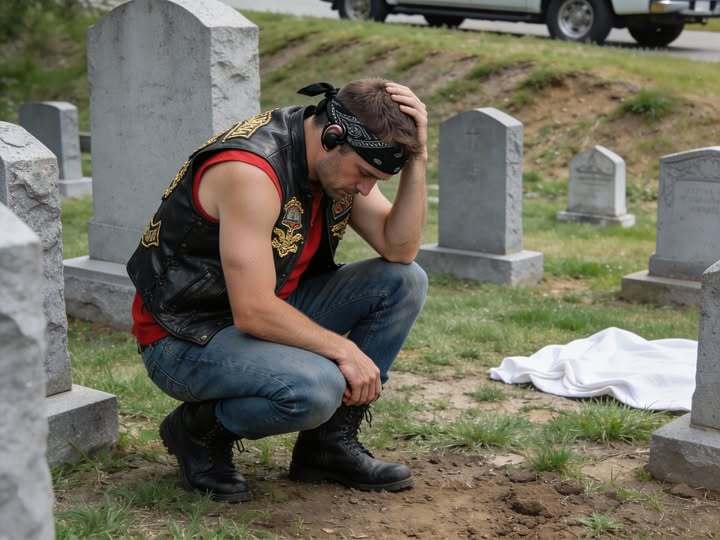 Every Saturday at exactly two in the afternoon, without fail, the sound of a motorcycle announced itself at the far end of the cemetery road. I learned the rhythm of it the way one learns the ticking of a clock after a long illness—resentfully at first, then obsessively. The rider always slowed near the old maple tree whose roots broke the ground like knuckles pushing upward. He parked there, removed his helmet with deliberate care, and walked a straight line toward my wife Sarah’s grave as though guided by muscle memory rather than sight. From my car, positioned a respectful distance away, I watched this ritual repeat itself week after week for six months. He never hesitated, never wandered, never checked the name on the stone as if to confirm he was in the right place. He already knew. The precision unsettled me. Grief had already hollowed my days, but this added a sharp, persistent edge—an unanswered question that gnawed at me in the quiet spaces where Sarah’s absence screamed the loudest.