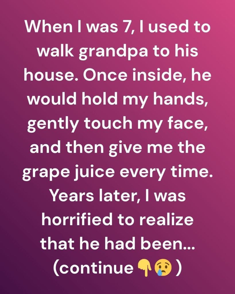 When I was seven years old, visiting my grandfather felt ordinary in the way childhood often turns routine into comfort without explanation. Every week, I would meet him at the corner store, where he waited patiently, hands folded, eyes scanning the street until he saw me. I believed my role was important: I was there to walk him home. He let me lead, matching his slow steps to mine, trusting me completely. At the time, I thought it was a game or perhaps a small responsibility he enjoyed giving me. His house sat quietly at the end of the street, unchanged and modest, smelling faintly of old books and clean laundry. Once inside, the same ritual unfolded every visit. He would take my hands in his, lift his gaze to my face, and study me with an intensity that felt both serious and gentle. Then he would smile, wordlessly, and pour us each a glass of grape juice. We would sit together in silence, the quiet never uncomfortable, his presence wrapping around me like reassurance.