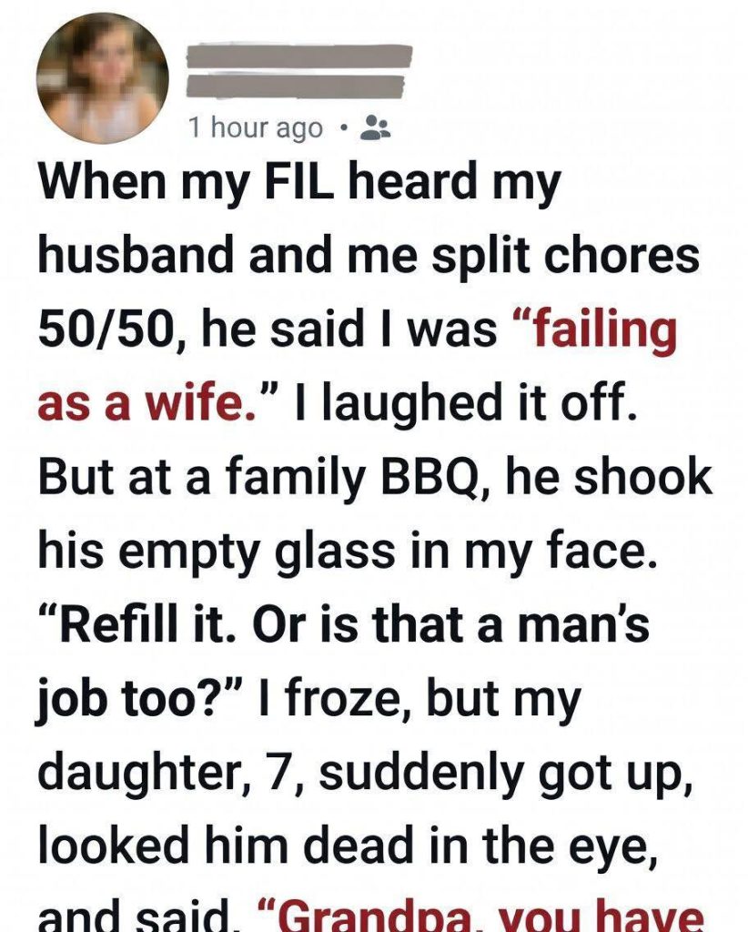 At first, it seemed like nothing more than a passing remark—one of those comments that drifts through a conversation and lingers just long enough to be noticed, but not long enough to demand a response. When my father-in-law laughed at the idea that my husband and I shared responsibilities at home, I chose not to react. His words, “You’re failing as a wife,” were delivered with a casual tone, almost playful on the surface, yet rooted in something deeper—an old belief system that quietly measured worth through roles rather than relationships. I smiled, nodded, and let it pass, convincing myself it wasn’t worth disrupting the peace. After all, not every opinion needs to be challenged, and not every moment calls for correction. Or so I thought.