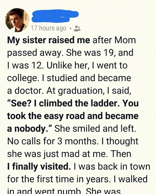 There are moments in life that feel insignificant when they happen, fragments of time wrapped in ordinary conversation, words spoken without hesitation because we believe we understand the world well enough to judge it. At the time, those moments pass quickly, barely leaving a trace in our awareness. But later—sometimes much later—they return with a weight that feels impossible to carry. I remember standing there on my graduation day, wrapped in celebration and certainty, convinced that everything I had achieved belonged solely to me. Applause echoed around me, faces blurred into a sea of approval, and in that moment, I felt untouchable. My beliefs were simple, almost comforting in their rigidity: success came from effort, and failure from the lack of it. There was no room for nuance, no space for unseen struggles or quiet sacrifices. In that narrow framework, I had already decided where everyone stood, including the person who had stood beside me my entire life. My sister, in my mind, was someone who had simply chosen less, settled earlier, expected little. I did not see her as someone who had given more. When I spoke to her that day, my words carried the sharpness of that belief. They were not shouted, not even emotional—just cold, certain, dismissive. For a brief second, I felt powerful, as though I had drawn a line that defined who I was. But what followed was not the reaction I expected. There was no argument, no anger. Only silence. A silence so heavy it seemed to absorb everything around it. She looked at me—not with resentment, but with a quiet understanding that I did not yet deserve. Her smile was soft, almost protective, and then she turned and walked away. In that moment, I believed I had won something. I didn’t realize I had just lost something I couldn’t yet name.