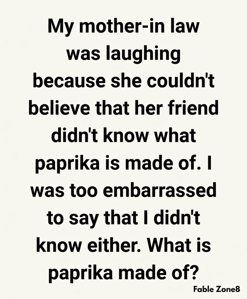 Her friend, a kind but somewhat reserved woman, asked a simple question about paprika—its taste, its origin, or what gave it that vibrant red hue. A harmless curiosity, yet the reaction it triggered was immediate and revealing. My mother-in-law burst into laughter, not in ridicule but in disbelief, as though the answer was so obvious it hardly needed speaking aloud. The laughter rolled across the room, pulling others into its rhythm. I sat there, cheeks warming, realizing that I did not know the answer either. A simple question had turned into a spotlight on my own ignorance.