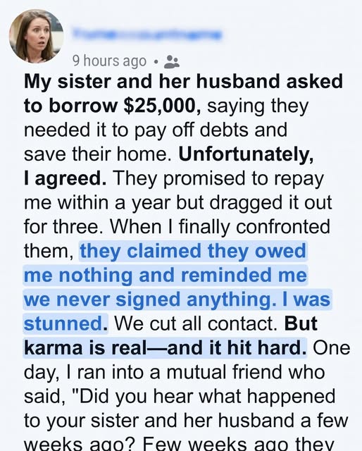 I remember the exact moment everything shifted, though at the time it didn’t feel like a breaking point—just another difficult conversation layered into an already stressful week. My sister called late that night, her voice trembling in a way I had never heard before. There was urgency, fear, and something else beneath it—something that made me instinctively set aside any doubt. She told me they were drowning. Bills had piled up, the mortgage was at risk, and everything they had built together felt like it was collapsing around them. I didn’t ask questions. I didn’t request proof or pause to weigh the risks. That’s not what family does, I told myself. Family shows up. Family helps without hesitation. So I did. I transferred $25,000—every cent I had spent years saving through long hours, missed opportunities, and quiet sacrifices. At the time, it didn’t feel like loss. It felt like purpose. Like I was stepping in when it mattered most. In the weeks that followed, they were grateful. There were emotional messages, promises to repay me, reassurances that they would never forget what I had done. I believed them—not because of what they said, but because of who they were to me. Or at least, who I thought they were. But gratitude, I would later learn, can be temporary when it is built on convenience. Time passed. Months turned into a year, then another, and then another. Each time I gently asked about repayment, there was always a reason. Something unexpected had come up. Timing wasn’t right. They needed just a little more time. I convinced myself patience was the right choice. That loyalty required endurance. Until the day I stopped asking softly and started asking clearly—and everything I believed began to unravel.