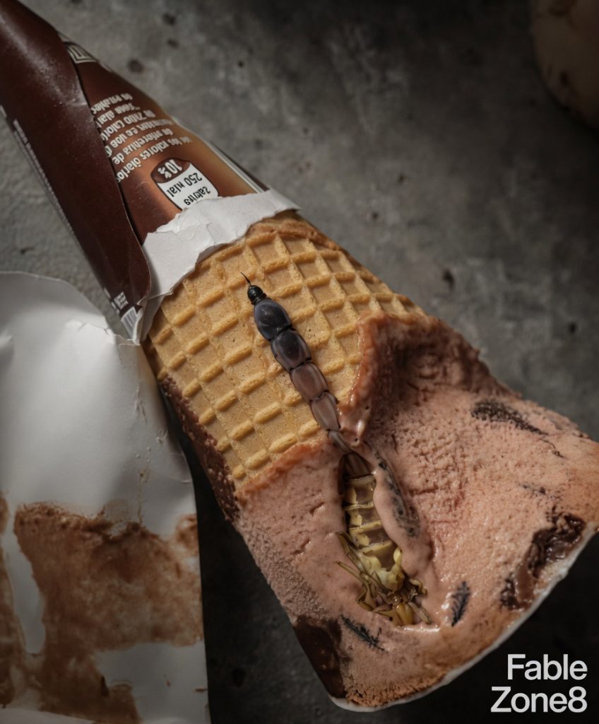It was small, dark, and disturbingly detailed—shaped in a way that closely resembled a scorpion. Its form appeared segmented, with a curved tail-like structure and tiny protrusions that looked eerily like pincers. Covered in melting ice cream, it glistened under the kitchen light, making the moment feel even more surreal.
