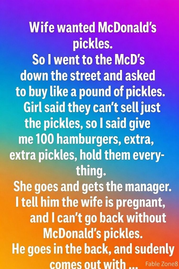 One ordinary evening turned into something unforgettable when my wife, who was pregnant at the time, suddenly developed a strong craving for pickles from a fast-food restaurant. It wasn’t just any craving—it was specific, urgent, and impossible to ignore, the kind that many expectant parents come to recognize as both unpredictable and deeply meaningful. Wanting to make her happy, I drove out with a simple mission: get those pickles. When I arrived and asked if I could buy just a container of pickles, the answer was polite but firm—store policy didn’t allow it. For a brief moment, I considered going home empty-handed, but the thought of disappointing her didn’t sit right. So, half joking and half determined, I said, “Alright, then give me 100 hamburgers with extra pickles and nothing else.” It sounded ridiculous even to me, but it was my way of finding a workaround. The cashier paused, unsure how to respond, and called the manager. When he arrived, I explained the real reason behind the strange request. There was a short silence, then a knowing smile. Without making it complicated, he disappeared into the back and returned with a large container filled with pickles. He handed it to me and simply said, “Take these to your wife. No charge.” In that moment, something shifted—it was no longer just about food, but about kindness, understanding, and humanity.
