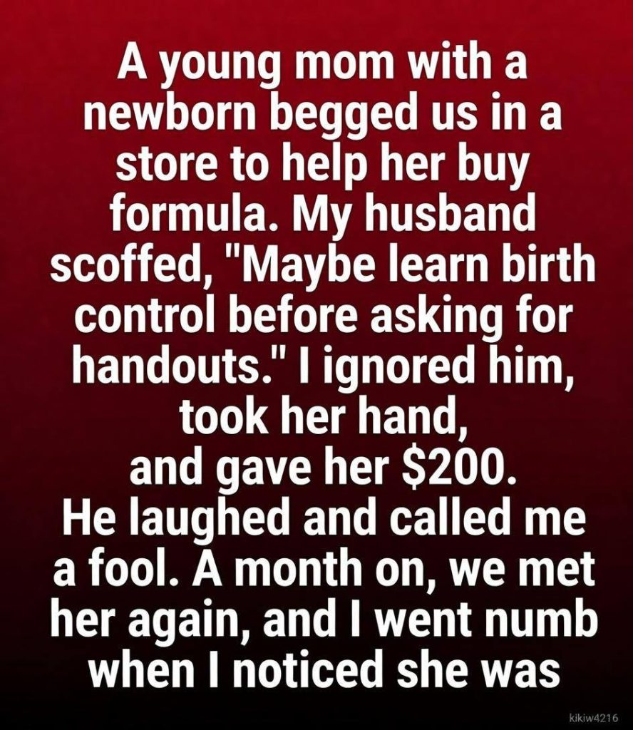 The moment I gave that young mother money, I thought I was helping a stranger.