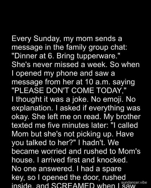 At first, I didn’t take it seriously. It felt too abrupt, too unlike her. My mom wasn’t dramatic, and she certainly wasn’t the type to cancel Sunday dinner without a reason—let alone one she wouldn’t explain. I stared at the message, rereading it, trying to fit it into some version of her personality that made sense.